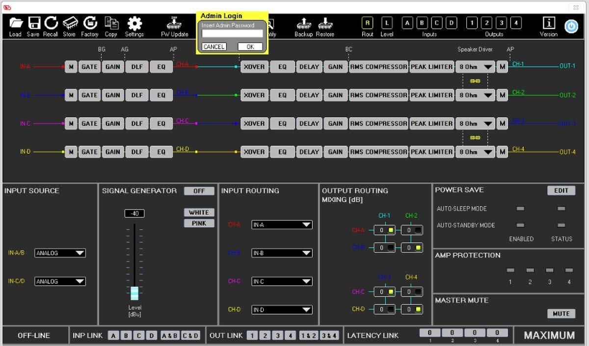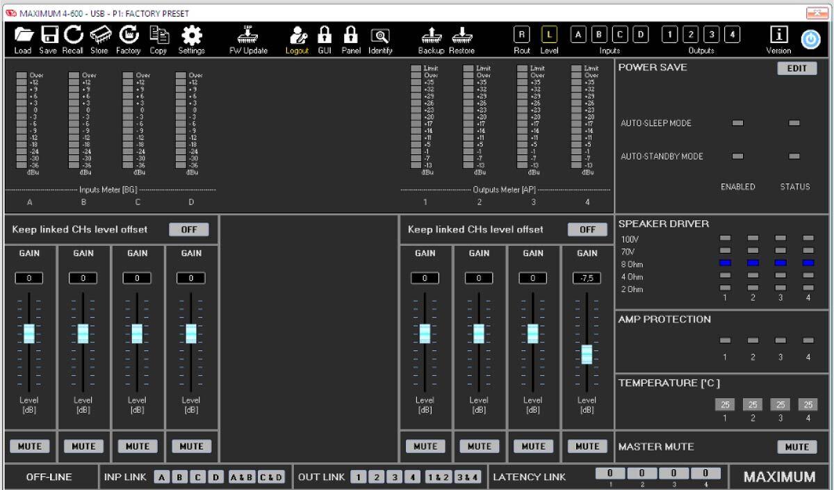 Прежде всего, нужно свыкнуться с мыслью, что усилители VOLTA MAXIMUM — это не просто усилитель мощности с встроенным DSP. Это комбинированный прибор, где процессор управляет преобразованием звукового сигнала, а также контролирует и корректирует работу оконечных каскадов усилителя мощности и блока питания, отслеживая важнейшие параметры последних. Эта возможность позволяет разгрузить от неэффективных энергетических затрат не только оконечные каскады, но и динамические головки, обратная связь от которых также влияет на функционирование усилителя мощности.