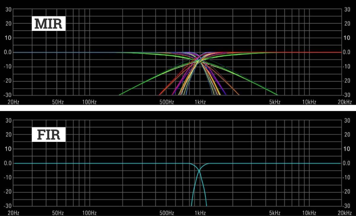 MIR-фильтр (Marani Impulse Response) значительно сокращает задержку, связанную с линейными фазовыми фильтрами, возвращает линейную фазовую характеристику и «звучит» как классический IIR-фильтр. MIR-фильтры с линейной фазовой характеристикой полностью воспроизводят крутизну среза аналоговых фильтров, также в эту секцию добавлены NXF-фильтры с крутизной среза от −40 до −75 дБ.
