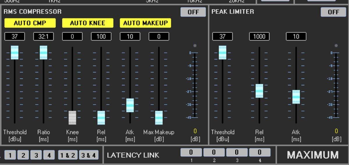 Использование RMS-компрессора и его настройка требует определённых знаний, так как от его настройки во многом зависят сохранность целостности восприятия звукового сигнала и звучание звукового комплекта в целом. Для его настройки нужно располагать точными данными о используемых громкоговорителях акустических систем. Мы уже писали об этом подробно. В помощь пользователю предлагается и автоматический режим работы устройства. Кроме того, чтобы минимизировать изменения уровня сигнала после его компрессирования, есть коррекционный фильтр MAKEUP, который работает как в ручном, так и автоматическом режиме.